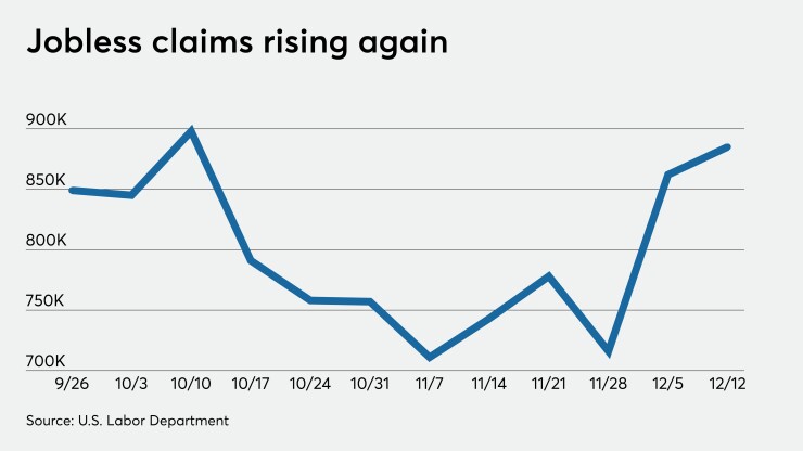 Initial jobless claims climbed to 885,000 on a seasonally adjusted annual basis in the week ended Dec. 12 from an upwardly revised 862,000 a week earlier, the Labor Department reported Thursday.