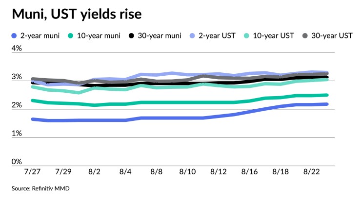 Refinitiv MMD's scale was cut two basis points at a 3 p.m. read: the one-year at 2.17% (+2) and 2.18% (+2) in two years. The five-year at 2.22% (+2), the 10-year at 2.50% (+2) and the 30-year at 3.13% (+2).