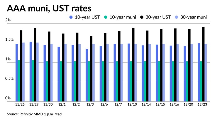 The IHS Markit municipal analytics curve was steady: 0.16% in 2022 and to 0.25% in 2023. The 10-year at 1.01% and the 30-year at 1.48% as of a 3 p.m. read.