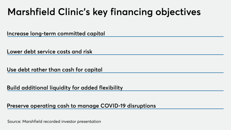 Wisconsin-based Marshfield Clinic Health System Inc. heads into the market as soon as Tuesday with a nearly $500 million new money and refunding issue that will restructure debt, fund acquisitions, and provide a cushion to manage through the COVID-19 pandemic’s wounds.