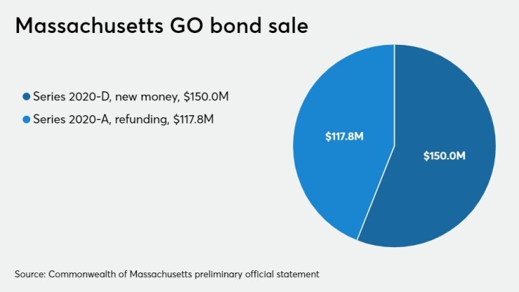 Massachusetts' sale involves $150 million of Series 2020-D new money bonds and $117.8 million of Series 2020-A refunding bonds. PFM is the financial advisor. Mintz, Levin, Cohn, Ferris, Glovsky and Popeo PC is bond counsel and disclosure counsel.