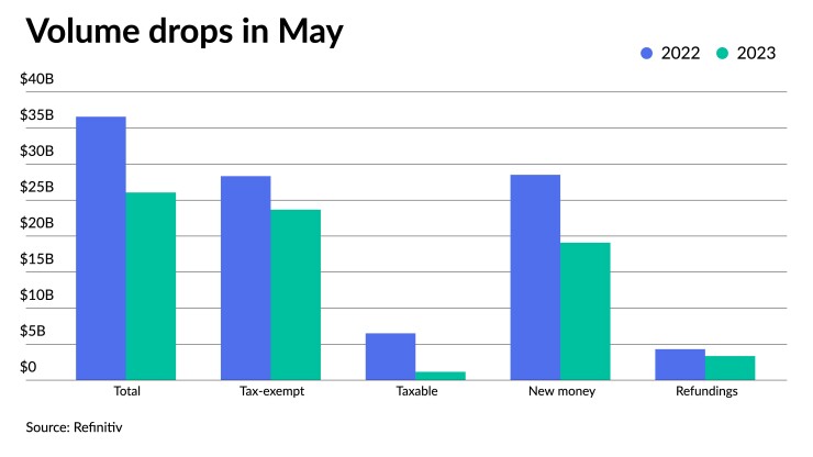 May municipal bond issuance dropped 29% year-over-year in May as issuers dealt with rising interest rates stemming from debt ceiling concerns, Federal Reserve policy uncertainty and overall market volatility.