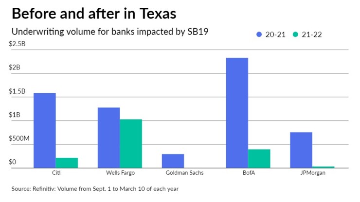 Citigroup and Wells Fargo have remained active in the bustling Texas muni market and were among 38 bond firms that since September submitted letters for the benefit of underwriting syndicate representatives verifying they do not discriminate against the firearms industry, according to a list posted on the Municipal Advisory Council of Texas website. Bond issuance out of Texas totaled $52.57 billion in 2021, the second biggest amount of debt behind California.