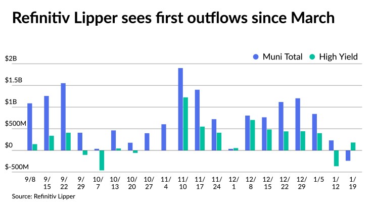 In the week ended Jan. 19, weekly reporting tax-exempt mutual funds saw $283.926 million of outflows, Refinitiv Lipper said Thursday. It followed an inflow of $231.121 million in the previous week and marks the first week of outflows after 45 consecutive weeks of inflows.