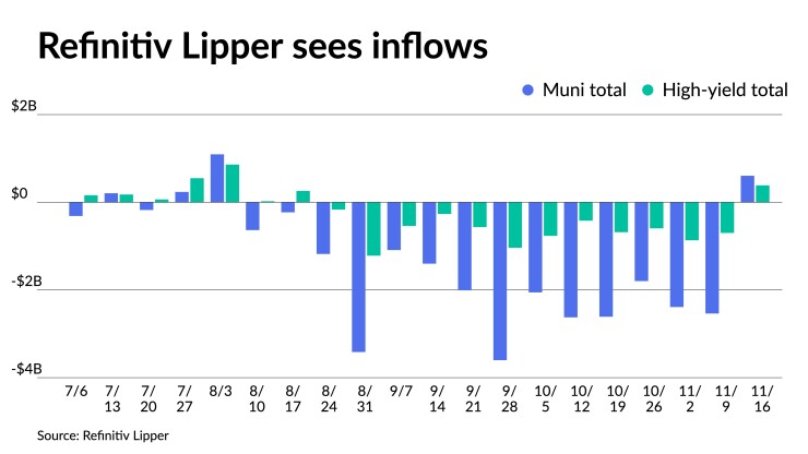 Refinitiv Lipper on Thursday reported $604.704 million of inflows from municipal bond mutual funds for the week ending Wednesday after $2.573 billion of outflows the week prior.