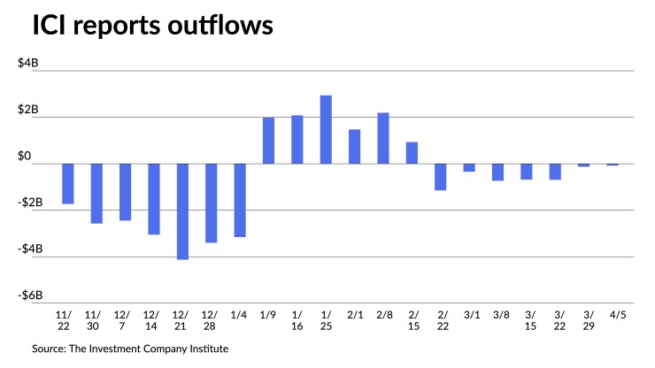 The Investment Company Institute reported investors pulled $83 million from mutual funds in the week ending April 5, after $128 million of outflows the previous week. Meanwhile, Exchange-traded funds saw inflows of $854 million after $184 million of inflows the week prior, per ICI data.