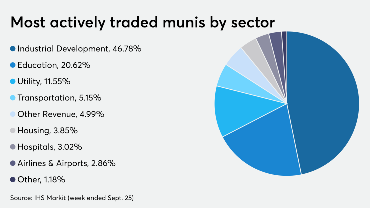 Last week, the most traded muni sector was industrial development followed by education and utilities, IHS Markit said.