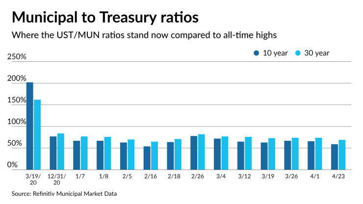 The 10-year muni-to-Treasury ratio was calculated at 59.3% while the 30-year muni-to-Treasury ratio stood at 68.9%, according to MMD.