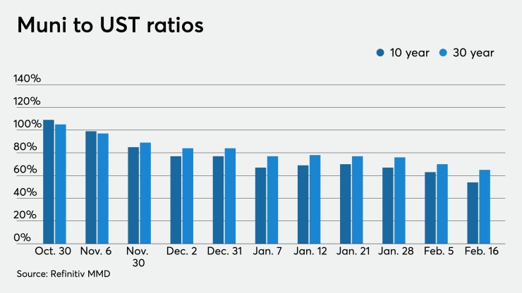 Rising U.S. Treasuries moved municipal to UST ratios even lower again. They fell four basis points to 54% in 10 years and two basis points to 65% in 30 years, according to Refinitiv MMD. ICE Data Services showed ratios fell two basis points to 54% in 10 years and fell two basis points to 66% in 30. BVAL showed 10-year ratios fall two basis points to 56% and three basis points lower at 70% in 30 years.