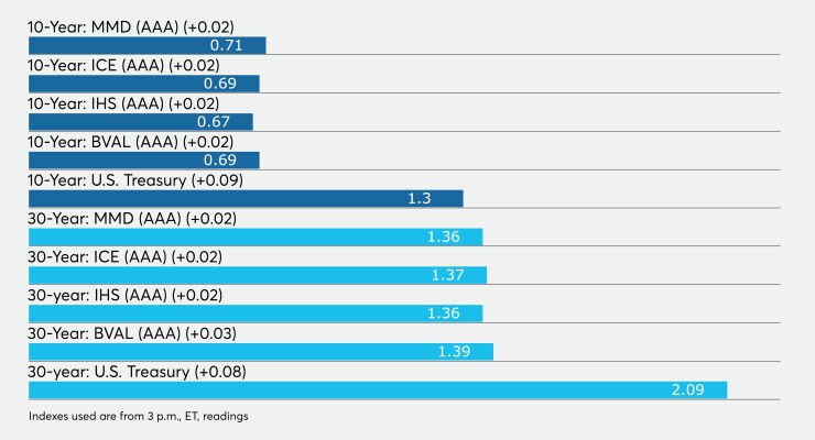 The IHS Markit municipal analytics AAA curve showed yields at 0.08% in 2022 and 0.09% in 2023 while the 10-year was at 0.67% and to 30-year at 1.36%.