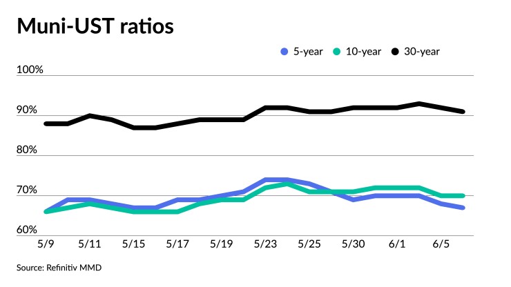 The two-year muni-Treasury ratio Tuesday was at 66%, the three-year at 68%, the five-year at 69%, the 10-year at 70% and the 30-year at 90%, according to Refinitiv MMD's 3 p.m. read. ICE Data Services had the two-year at 66%, the three-year at 69%, the five-year at 67%, the 10-year at 70% and the 30-year at 91% at 4 p.m.