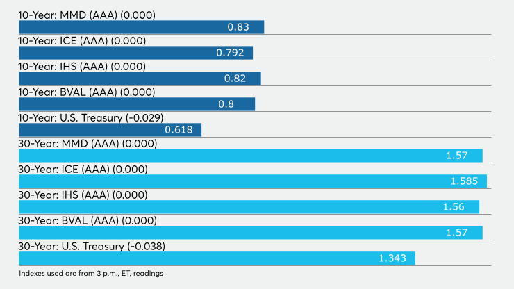 The IHS Markit municipal analytics AAA curve showed the 2021 maturity yielding 0.15% and the 2022 maturity at 0.17% while the 10-year muni rose one basis point to 0.82% and the 30-year gained one basis point to 1.56%.