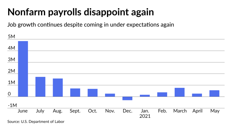 The Labor Department said nonfarm payrolls rose 559,000 in May as the jobless rate fell to 5.8% from 6.1%. The numbers showed slow but steady strength in the labor market, but came in under some economists'