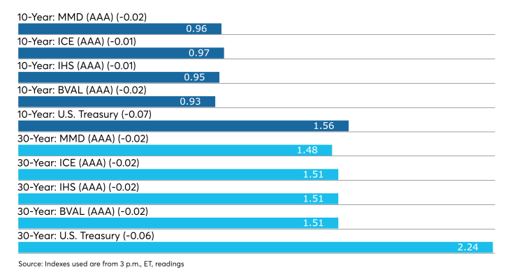 The BVAL AAA curve showed the yield on the 2021 maturity at 0.07% and the 2022 maturity at 0.09% while the 10-year fell two basis points to 0.93% and the 30-year dropped two basis points to 1.50%