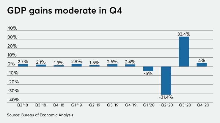 In the fourth quarter of 2020, GDP rose 4.0%, according to the advance estimate, after a 33.4% rebound in the third quarter, which followed the 31.4% plunge in the second quarter. Economists polled by IFR Markets expected that gain.