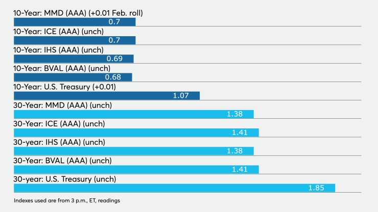 The IHS Markit municipal analytics AAA curve showed yields at 0.11% in 2022 and 0.12% in 2023 while the 10-year remained at 0.69% and the 30-year yield at 1.38%.