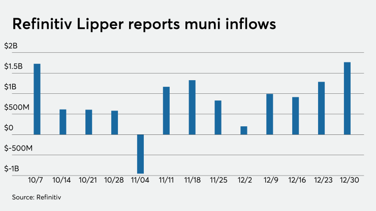Weekly reporting tax-exempt mutual funds saw $1.767 billion of inflows in the week ended Dec. 30, Refinitiv Lipper reported last week. It followed an inflow of $1.288 billion in the previous week.