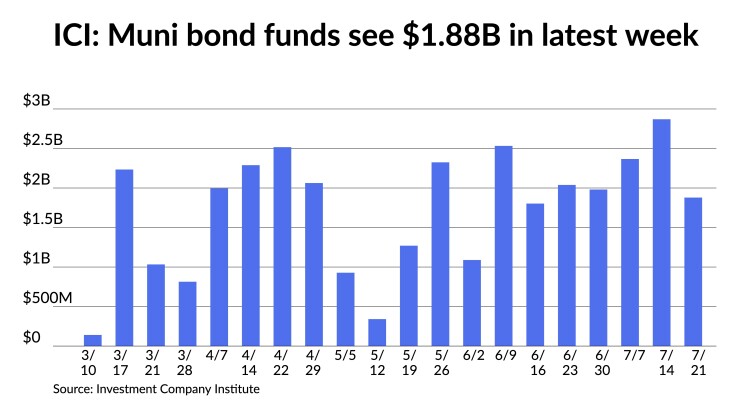 The Investment Company Institute reported another week of inflows, $1.879 billion for the week ending July 21, down from $2.879 billion the week prior, but still a strong showing for the fund complex that hit its 20th consecutive week of inflows.