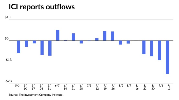 The Investment Company Institute Wednesday reported investors pulled $1.566 billion from municipal bond mutual funds in the week ending Sept. 13 after $925 million of outflows the previous week.