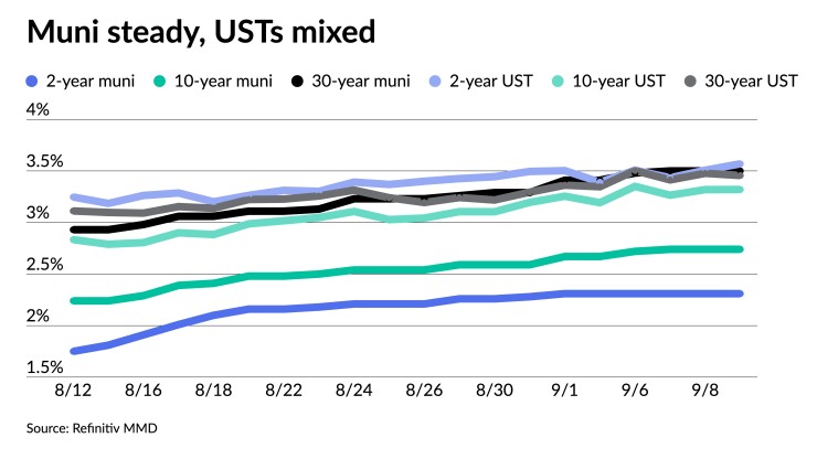 The IHS Markit municipal curve was unchanged: 2.26% in 2023 and 2.34% in 2024. The five-year was at 2.44%, the 10-year was at 2.75% and the 30-year yield was at 3.48% at a 4 p.m. read.