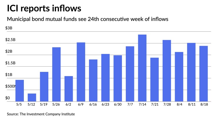Fund flows continue on a tear, with the Investment Company Institute reporting $2.385 billion of inflows into municipal bond mutual funds for the week ending Aug. 18, down from $2.513 billion the week prior.
