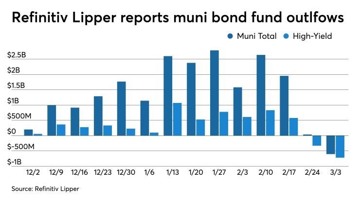 In the week ended March 3, weekly reporting tax-exempt mutual funds saw $600.044 million of outflows. It followed an inflow of $37.683 million in the previous week.
