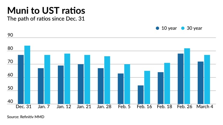 Ratios fell again with muni yields Thursday. The 10-year muni/UST was reported at 72% and the 30-year at 77%, according to Refinitiv MMD. ICE Data Services showed ratios at 70% in 10 years and 78% in 30. Bloomberg BVAL had the 10-year at 77% and the 30 at 83%.