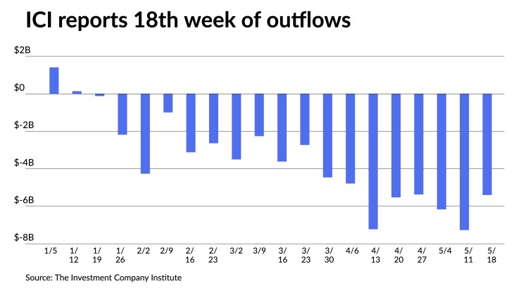 The Investment Company Institute reporting investors pulled $5.398 billion from muni bond mutual funds in the week ending May 18, down from $7.270 billion of outflows in the previous week, but marking the 18th consecutive week bringing ICI's 2022 total figure to $70.1 billion. Refinitiv Lipper, which reports Thursday, has the total outflows for the year at $36.5 billion.
