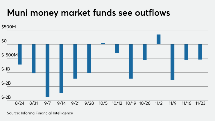 Tax-exempt municipal money market fund assets fell $540.6 million, bringing total net assets to $109.74 billion in the week ended Nov. 23, according to the Money Fund Report, a publication of Informa Financial Intelligence. In the prior week, assets fell $545.5 million to $110.28 billion.