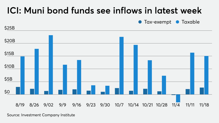 Long-term municipal bond funds and exchange-traded funds saw combined inflows of $2.675 billion in the week ended Nov. 18, the Investment Company Institute reported Wednesday. In the week ended Nov. 11, muni funds saw an inflow of $2.089 billion, ICI said.