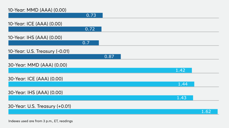The IHS Markit municipal analytics AAA curve showed short yields at 0.13% and 0.14% in 2021 and 2022, respectively, and the 10-year steady at 0.70% as the 30-year yield remained unchanged at 1.44%.