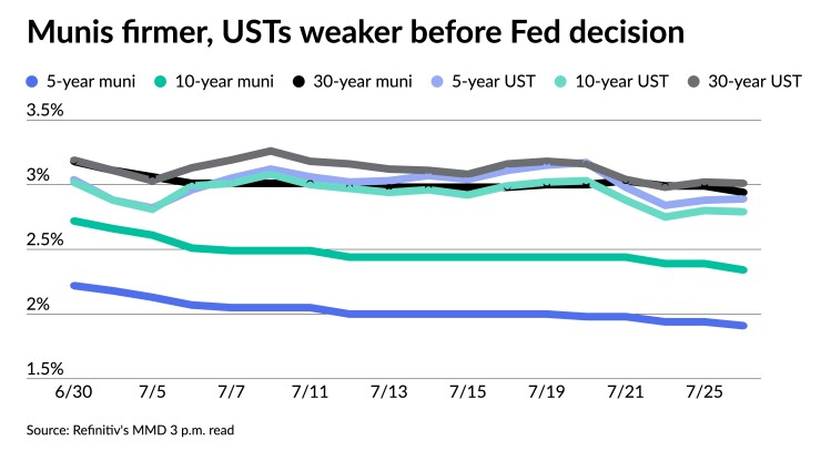 Municipals were firmer Tuesday ahead of the conclusion of the July Federal Open Market Committee meeting where a three-quarter point rate hike is likely, while U.S. Treasuries were weaker and equities sold off.