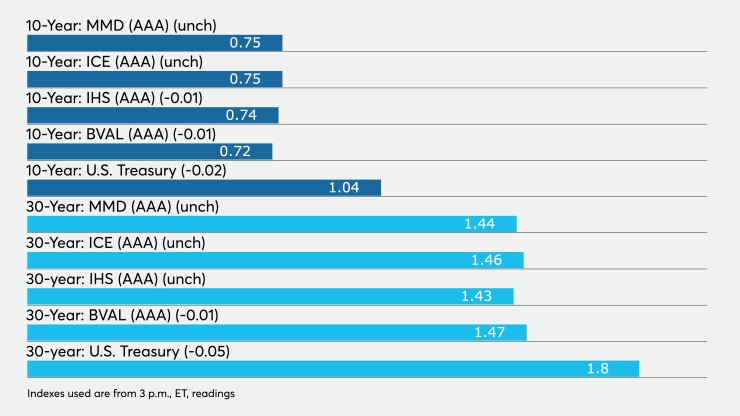 The IHS Markit municipal analytics AAA curve showed yields at 0.13% in 2022 and 0.14% in 2023 while the 10-year remained at 0.74% and the 30-year yield at 1.43%, also unchanged.