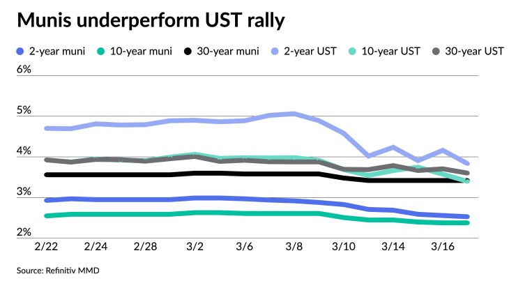 Municipals were firmer in spots to end a chaotic week that saw triple-A benchmarks both follow U.S. Treasuries in a flight to quality and ignore UST movements — as munis did on Friday for the most part — as the banking sector crisis continued. USTs rallied and equities sold off Friday.