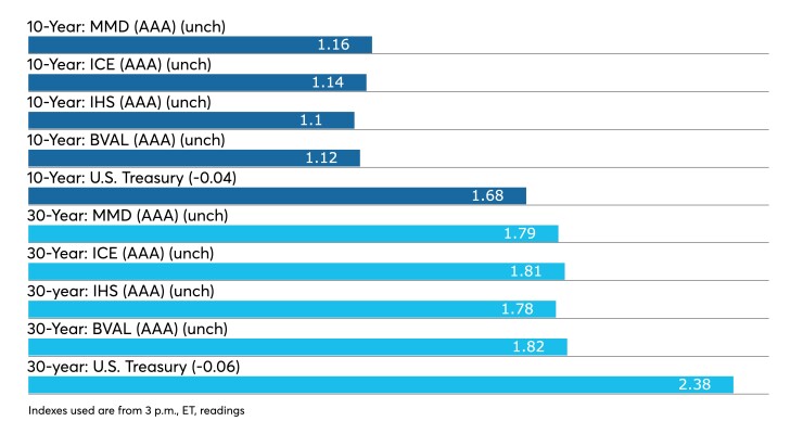 The IHS Markit municipal analytics' AAA curve showed yields at 0.14% in 2022 and 0.19% in 2023, the 10-year steady at 1.10%, and the 30-year also steady at 1.78%.