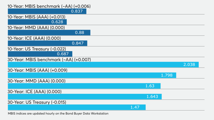 The IHS Markit municipal analytics AAA curve showed the 2021 maturity yielding 0.21% and the 2022 maturity at 0.26% while the 10-year muni was at 0.88% and the 30-year stood at 1.63%.