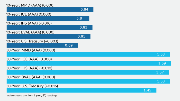 The IHS Markit municipal analytics AAA curve showed the 2021 maturity yielding 0.13%, the 2022 maturity at 0.14%, the 10-year muni at 0.83% and the 30-year at 1.57%.