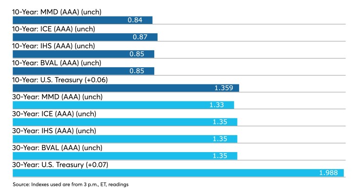 The IHS Markit municipal analytics curve showed short yields at 0.07% and 0.10% in 2022 and 2023, respectively, with the 10-year steady at 0.84%, and the 30-year yield also unmoved at 1.35%.