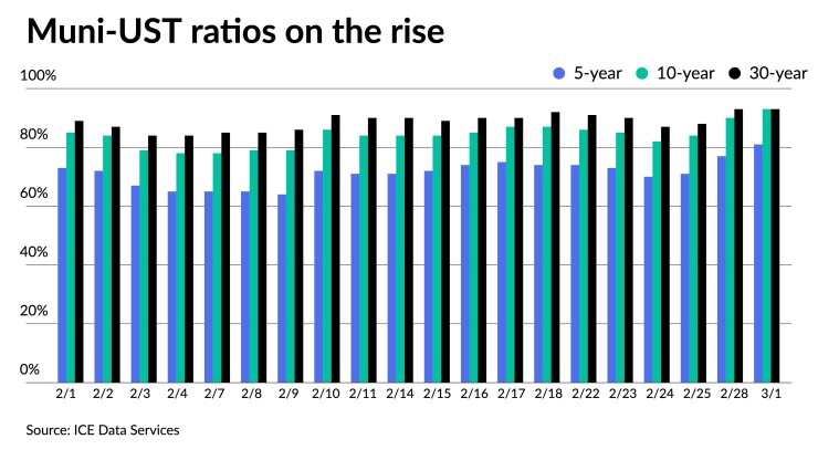 Municipal to UST ratios rose as a result of the moves, putting five-year at 84% (up from 77% Monday), 89% in 10 (up from 86%) and 91% in 30 (unch), according to Refinitiv MMD's 3 p.m. read. ICE Data Services had the five at 80% (up from 77%), the 10 at 93% (up from 90%) and the 30 at 92% (unch) at a 4 p.m. read.