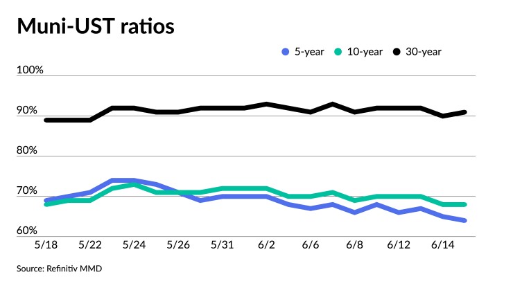 The two-year muni-Treasury ratio Thursday was at 63%, the three-year at 66%, the five-year at 67%, the 10-year at 69% and the 30-year at 91%, according to Refinitiv MMD's 3 p.m. read. ICE Data Services had the two-year at 63%, the three-year at 65%, the five-year at 64%, the 10-year at 68% and the 30-year at 91% at 4 p.m.