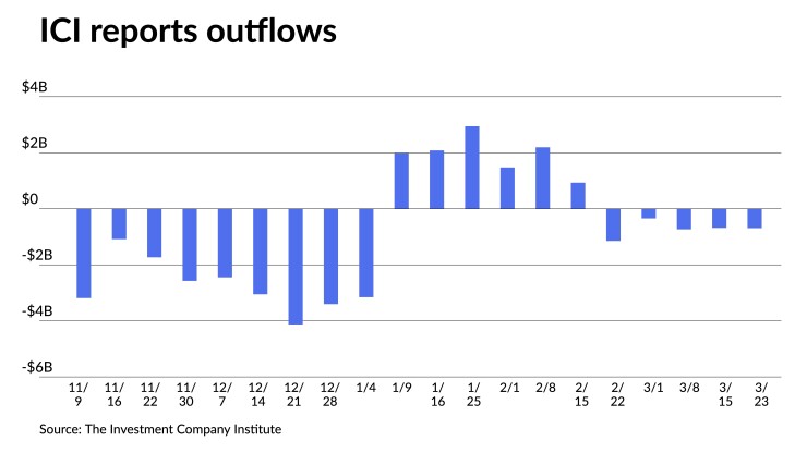 Outflows continued, with the Investment Company Institute reporting investors pulled $693 million from mutual funds in the week ending March 22, after $684 million of outflows the previous week.