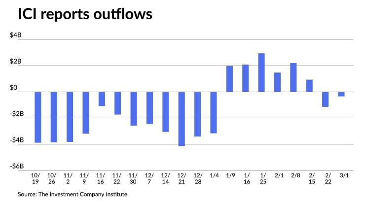 Outflows lessened, with the Investment Company Institute reporting investors pulled $344 million from mutual funds in the week ending March 1, after $1.148 billion of outflows the previous week.