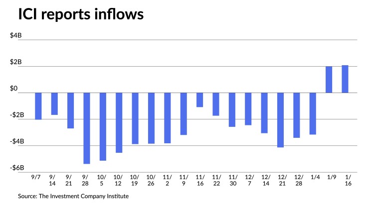 Inflows continued with the Investment Company Institute reporting investors added $2.083 billion to mutual funds in the week ending Jan. 18, after $1.982 billion of inflows the previous week.