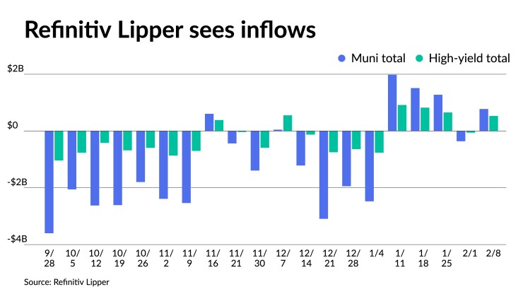 Refinitiv Lipper reported $775.006 million of municipal bond mutual fund inflows for the week that ended Wednesday following $361.649 million of outflows the previous week.