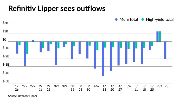 In the week ended June 8, Refinitiv Lipper reported $2.094 billion of outflows Thursday, following an inflow of $1.216 billion the previous week.