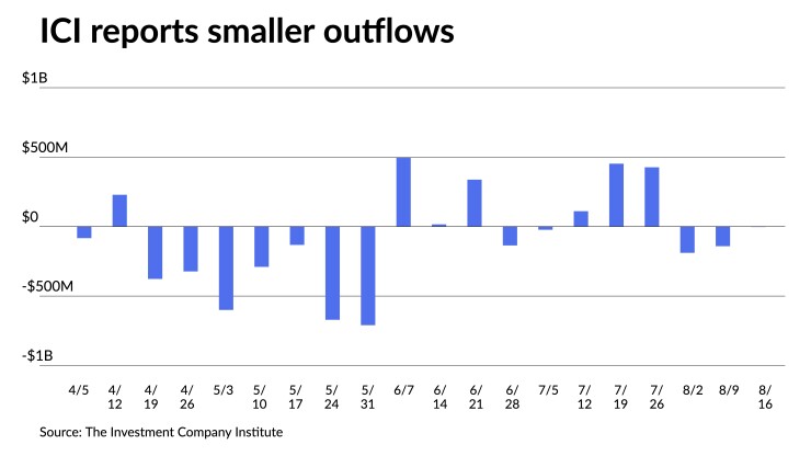 The Investment Company Institute reported investors pulled $3 million from municipal bond mutual funds in the week ending Aug. 16, after $141 million of outflows the previous week. ETFs saw outflows of $168 million after $500 million of inflows the week prior.