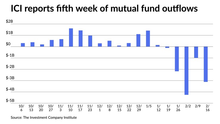The Investment Company Institute on Wednesday reported $3.120 billion of outflows in the week ending Feb. 16, up from $993 million of outflows in the previous week.