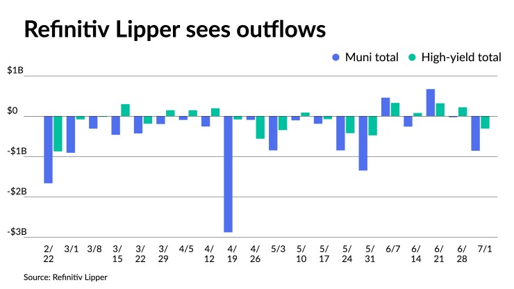 Refinitiv Lipper reported $855.719 million of outflows from municipal bond mutual funds for the week that ended Wednesday following $25.331 million of outflows the week prior.