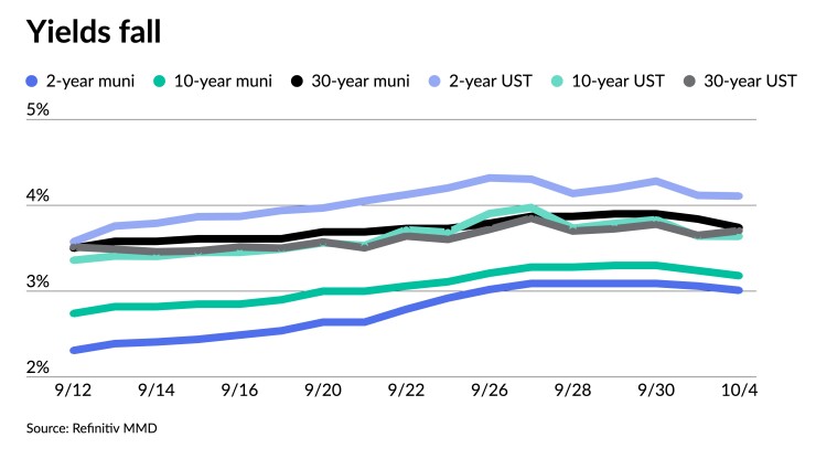 Triple-A yields fell four to 10 basis points across the curve amid robust secondary trading with high-grade names showing clear moves to lower yields. New York City priced $1.35 billion of exempt and taxable general obligation bonds to strong demand and were bumped in a final pricing.