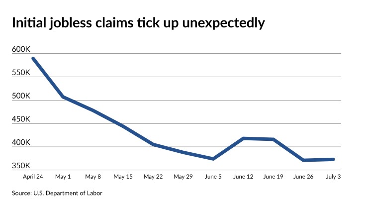 Initial jobless claims rose to 373,000 in the week ended July 3 from an upwardly revised 371,000 the week before, first reported as 364,000 claims.